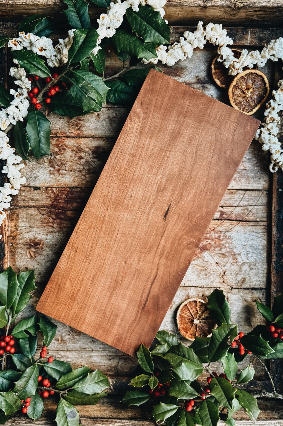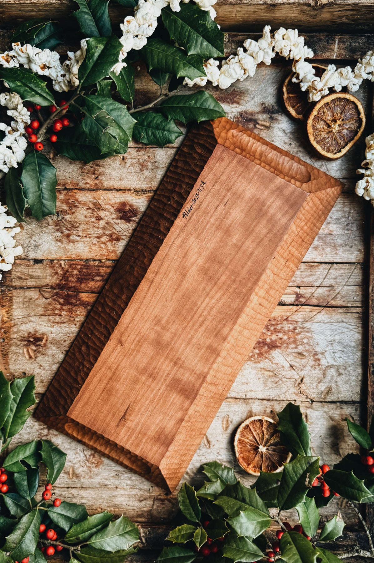 This listing is for one (1) ready-to-ship Gourmet Serving Tray made from Cherry. It features incredibly rustic details and beautiful carved indentions on either end for ease of lifting. Approx 13.75" long x 6.25" wide x 1" thick. Signed and dated by the maker. You will receive the exact item pictured.