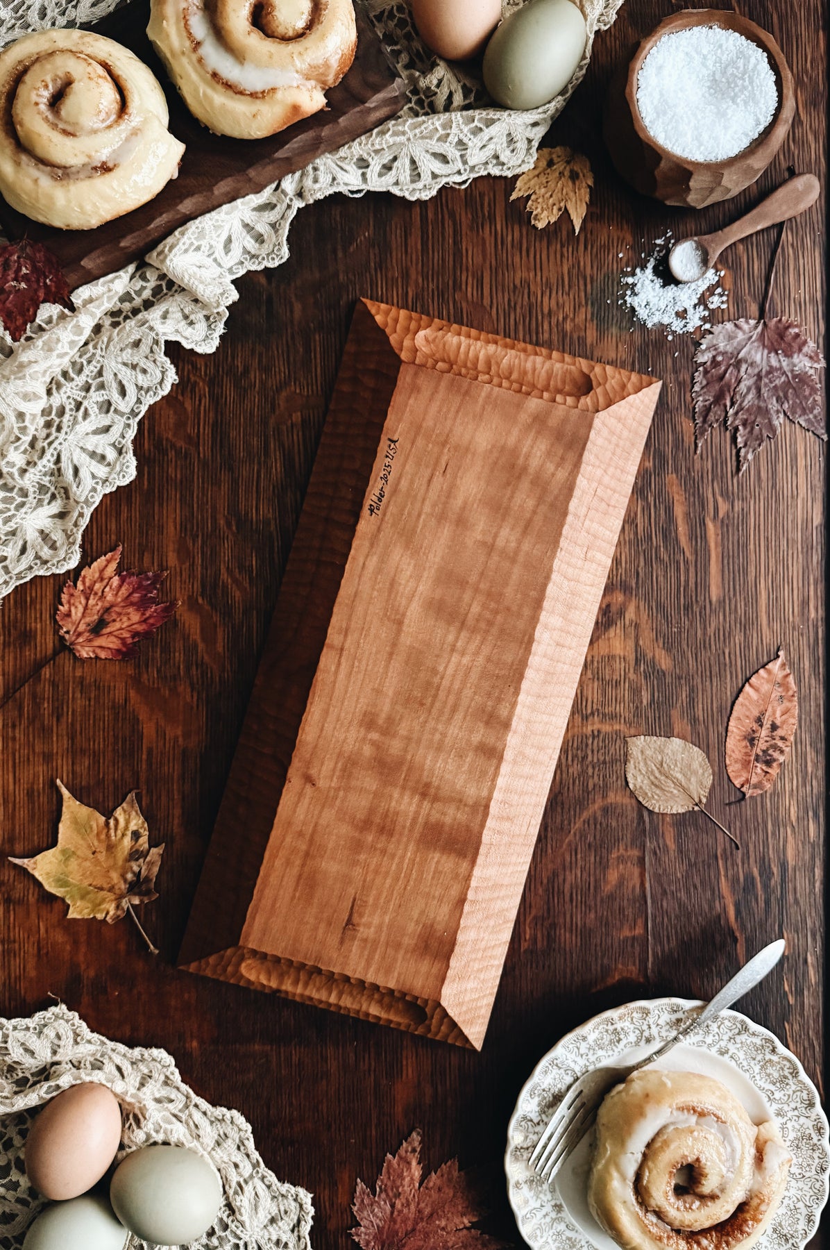 This listing is for one (1) ready-to-ship Gourmet Serving Tray made from Cherry. It features incredibly rustic details and beautiful carved indentions on either end for ease of lifting. Approx 13.75" long x 6.25" wide x 1" thick. Signed and dated by the maker. You will receive the exact item pictured.
