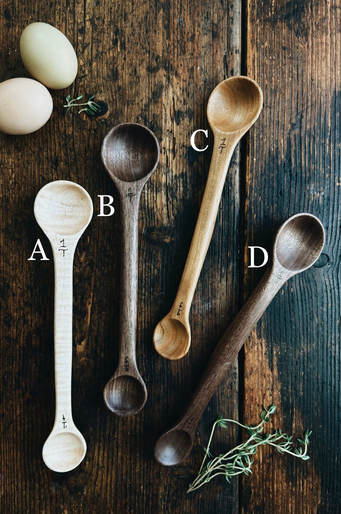 This listing is for an assortment of ready-to-ship Double Sided Measuring Spoons in various wood types. The cost is for one (1) spoon. Please make your selection before adding to cart. You will receive the exact item of your choice.