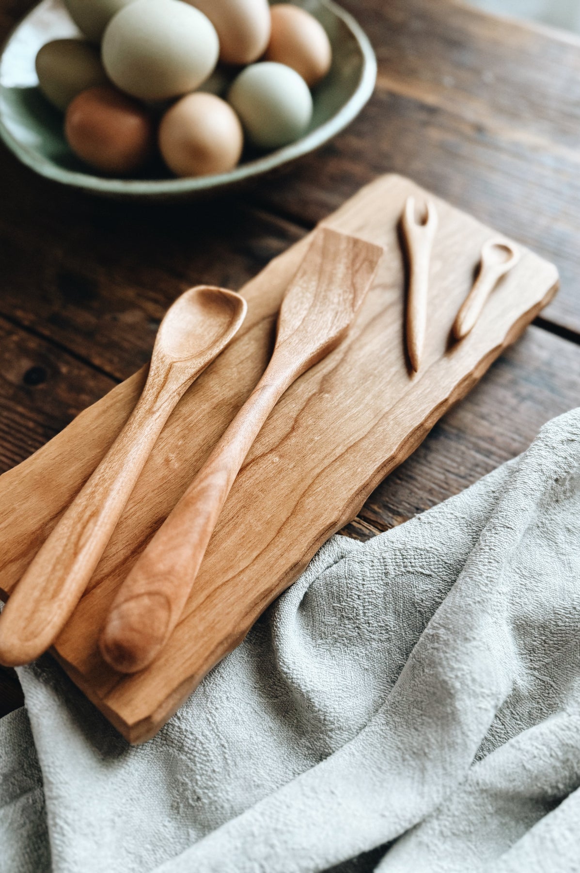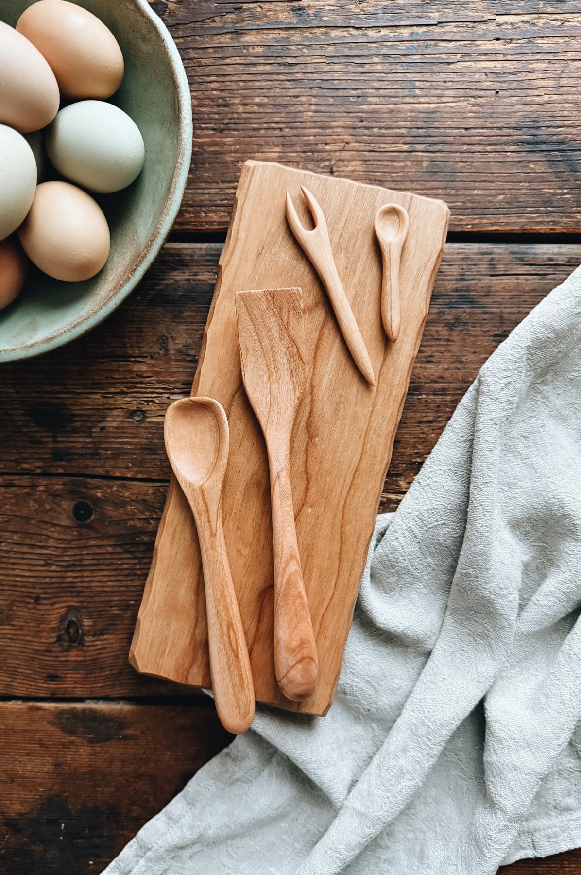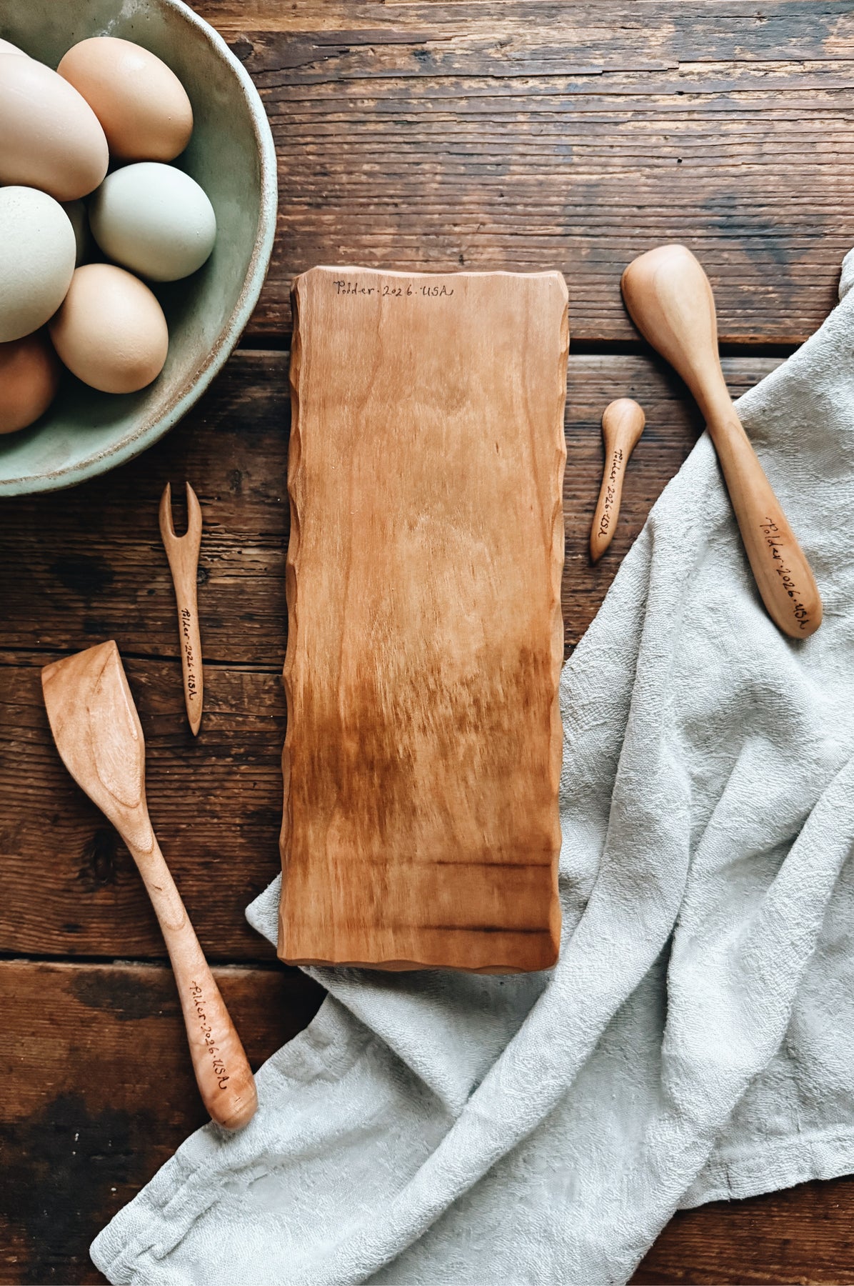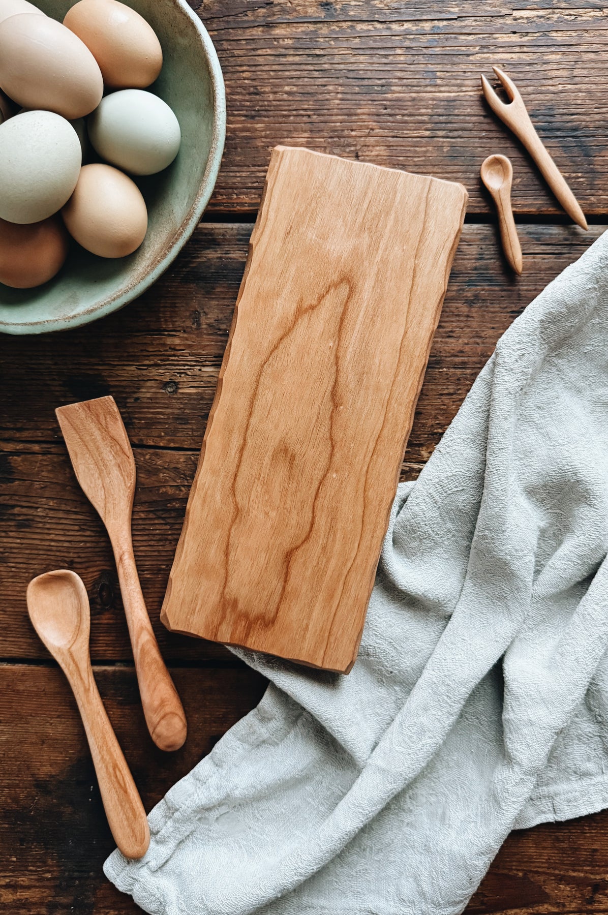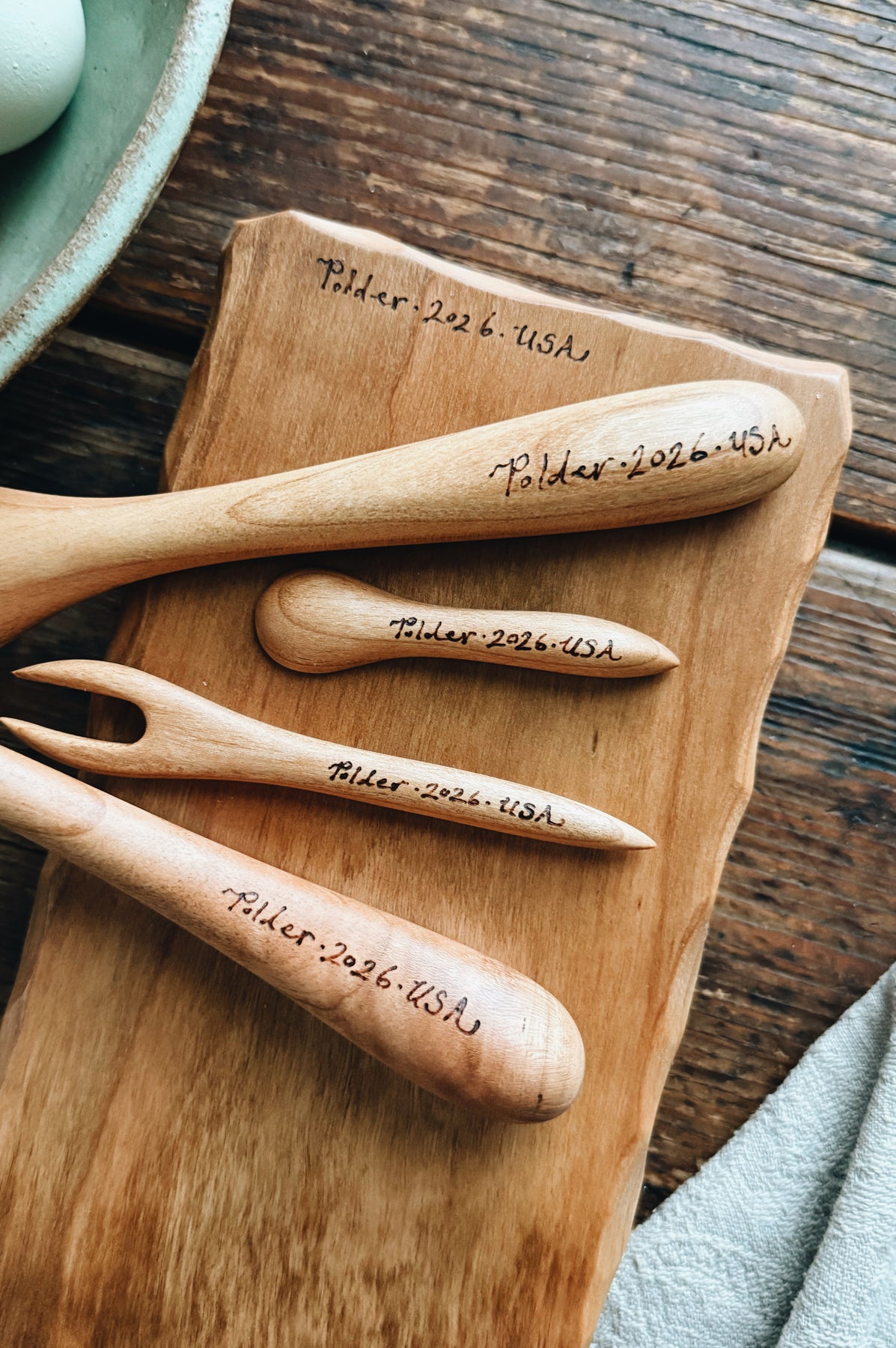 This listing is for one ready-to-ship Charcuterie for Two Set (5 pieces) made from Cherry. The set includes 1 x Petite Salami Board (11" x 4.5" x 1"), 1 x Simple Spreader (8.25"), 1 x Jelly Spoon (5.5" long), 1 x Tiny Jam Spoon (3"), and 1 x Tiny Fork (4.25"). You will receive the exact items shown.