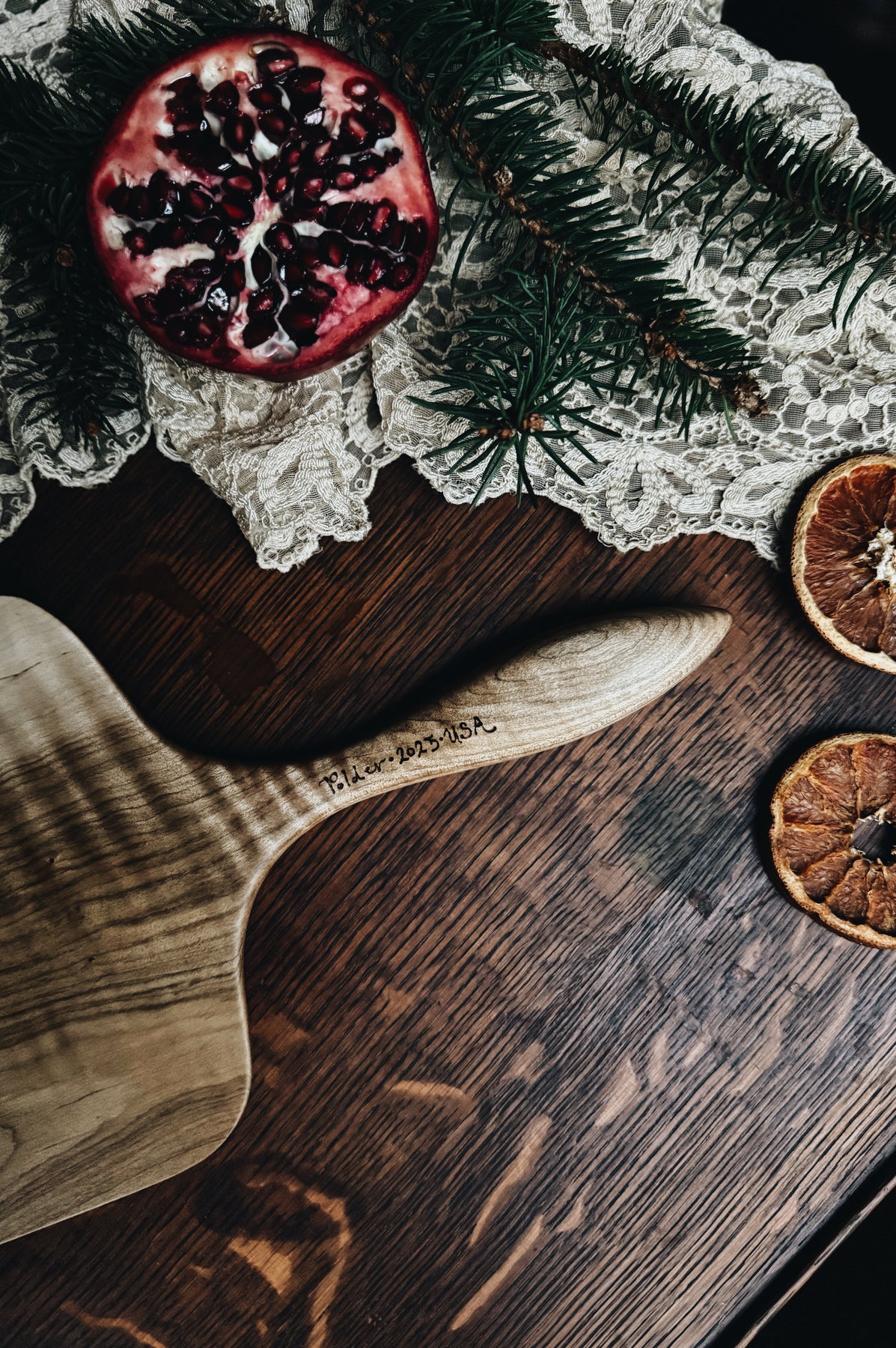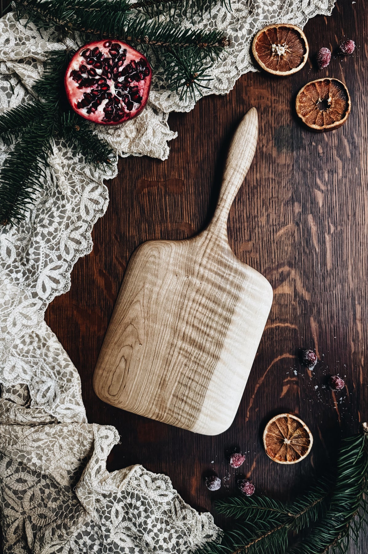Handcrafted from a solid piece of wood, this exquisite utensil will be your constant companion as you reach for it over and over again. You may use it as a small counter-to-table cutting board or as an elegant serving tray for h'orderves...as a cheese board, or as a spatula to remove cookies and free-form bread loaves from a baking sheet. The possibilities are endless. This stunning piece would make a wonderful gift for a home chef or cook, sure to be treasured and enjoyed for a lifetime.