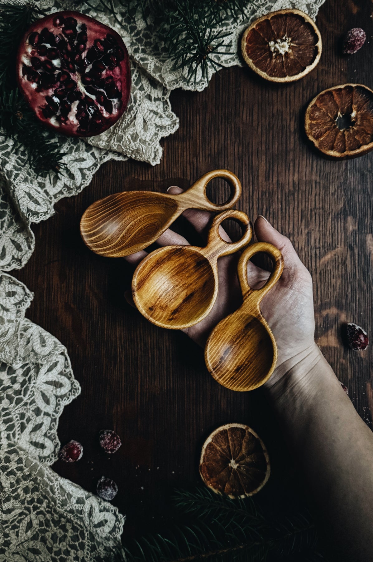An exquisitely beautiful set of hand carved scoops full of rustic sophistication. These gorgeous little utensils are perfect for coffee. Use them for scooping granola into parfaits, or chia seeds into your morning smoothie. Each one is carefully handcrafted from solid hardwood right on our family farm in Virginia. This would make a very special gift for any foodie or coffee lover. Will arrive beautifully packaged and ready for gifting.